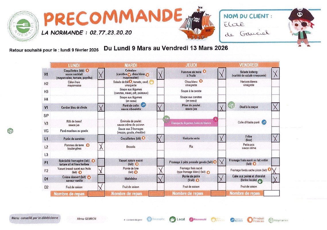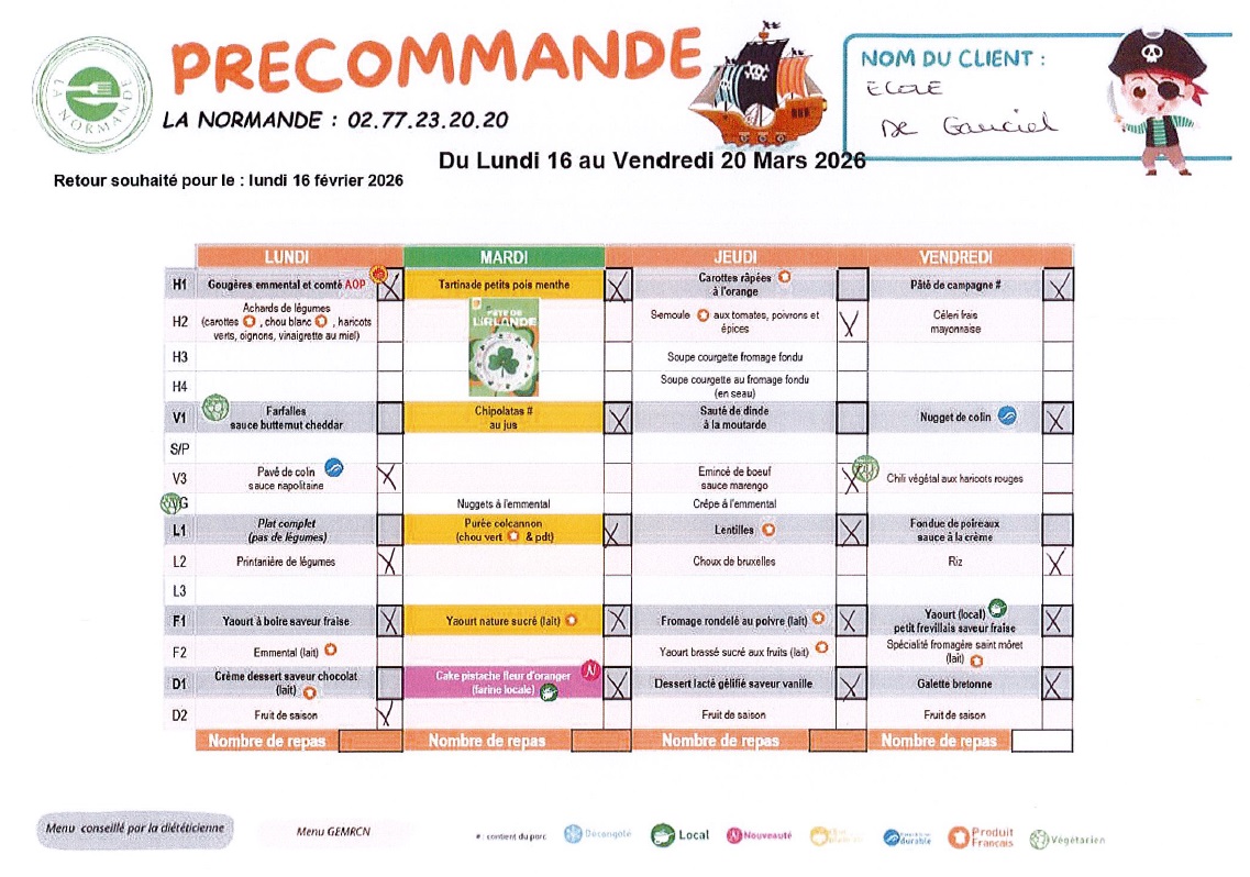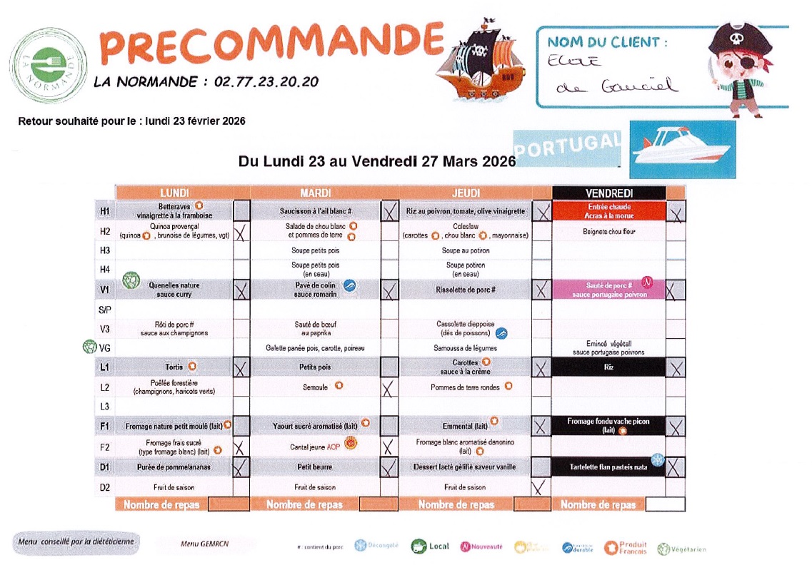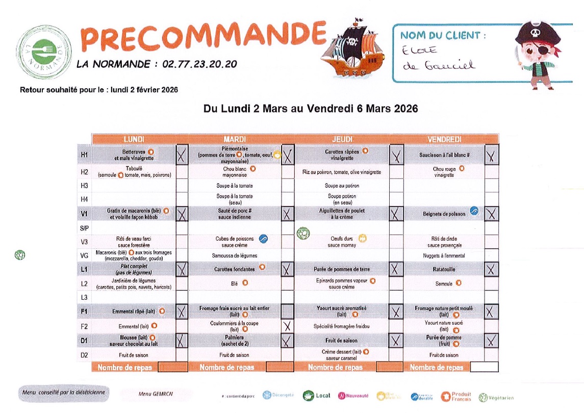 Menu du 02 au 06 mars 2026