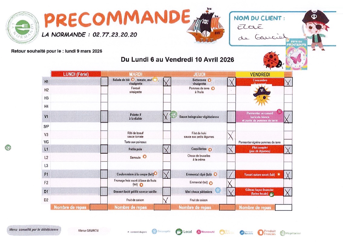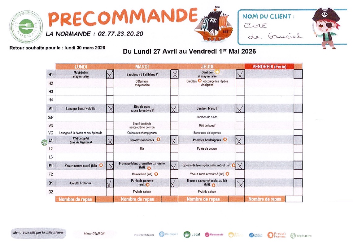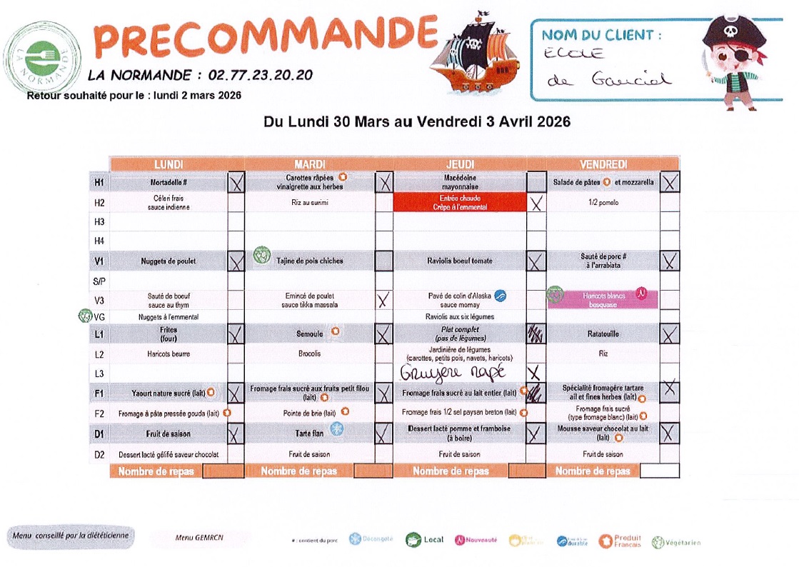 Menu du 30 mars au 03 avril 2026